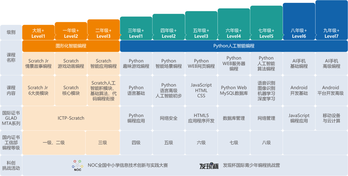 人工智能編程,面向6-18歲青少年,依托上市教育集團20年編程教育經驗,研發出一套系統的少兒編程學習體系,內容涵蓋圖形化智能編程(Scratch Jr、Scratch)和Python人工智能編程(Python、JavaScript、HTML、CSS、Java)等,培養編程思維,提高中國孩子的綜合能力和素質。課程流動課堂走進全國數百所中小學公立校,受到教育界和學生家長的高度認可。