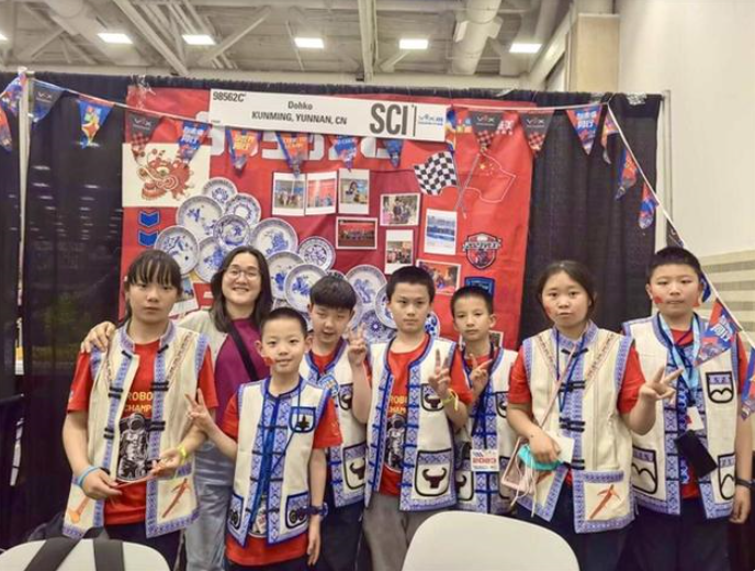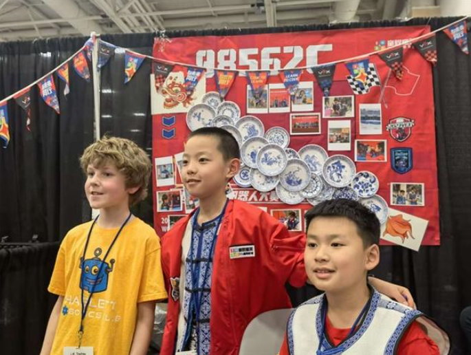 2023年4月,在美國(guó)達(dá)拉斯舉辦的第十五屆VEX世錦賽現(xiàn)場(chǎng),幾位中國(guó)少年形成了一道靚麗的風(fēng)景線。青花瓷拼成的龍?jiān)卦谥袊?guó)紅的背景上一躍而出,向世界展示著中國(guó)文化的絢麗多彩。據(jù)悉,他們是來(lái)自中國(guó)知名少兒編程與機(jī)器人教育機(jī)構(gòu)童程童美的參賽選手。